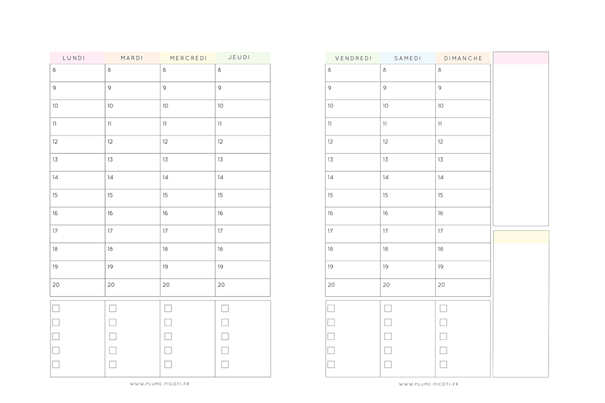 Le deuxième à découvrir est un semainier / weekly. Il est assez différent de ce que je fais d’habitude puisqu’il a évolué avec mes besoins. Celui-ci comporte toute une partie horaires dans laquelle je créé des planches horaires avec mes rendez-vous mais aussi mon organisation au quotidien. J’y ai inséré toutefois une petite partie Todolist journalière même si j’avoue préféré la version semaine pour me sentir moins submergée. Comme pour le mois, j’y ai inséré deux cases en plus et totalement libre. J’y note la To Do de la semaine justement et les choses importantes à penser et l’autre me sert pour noter certaines réceptions.