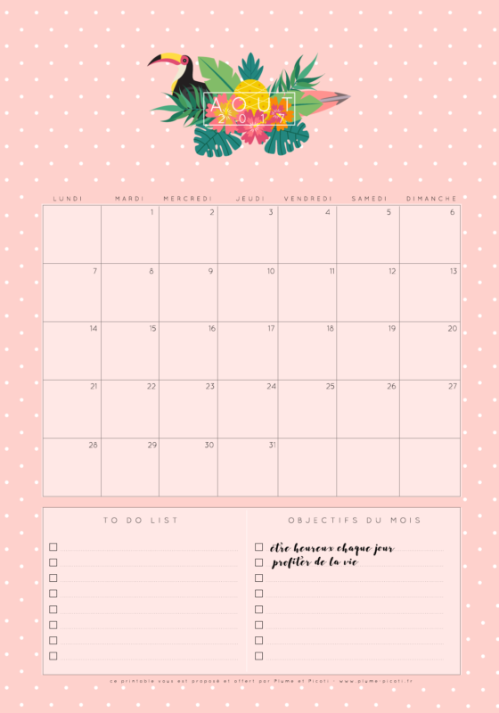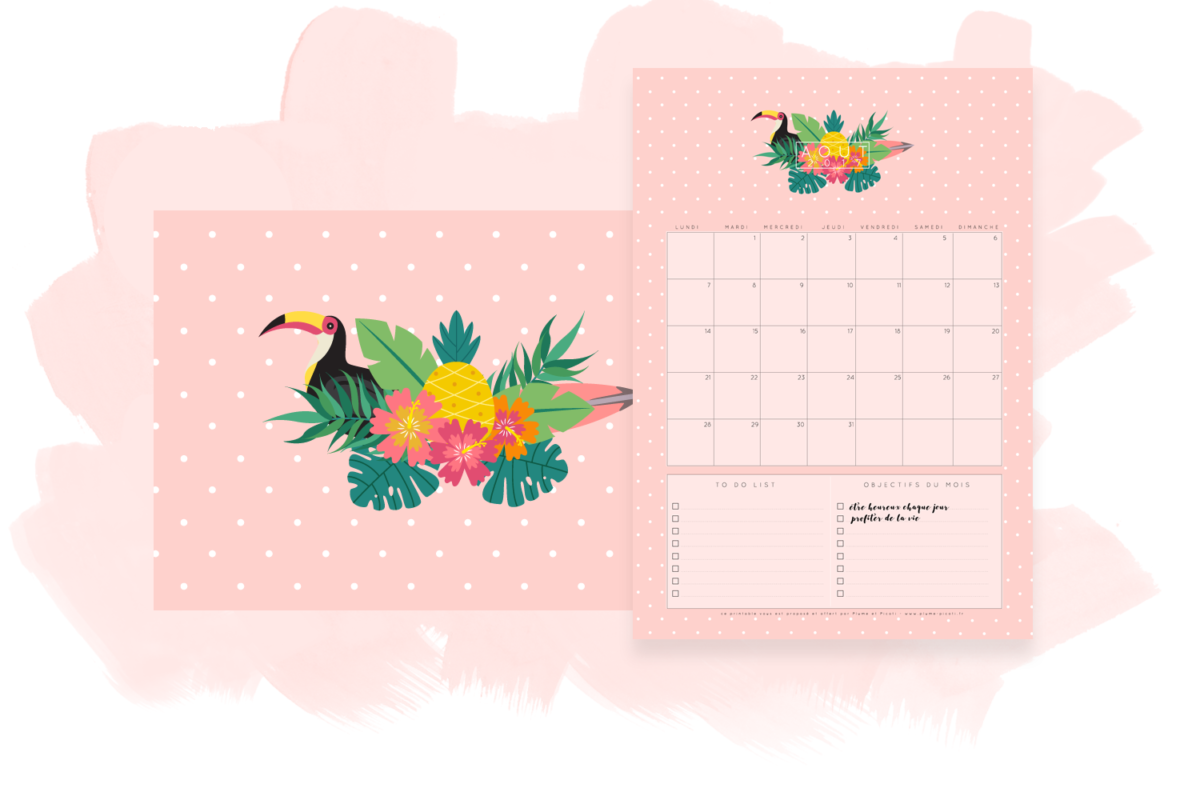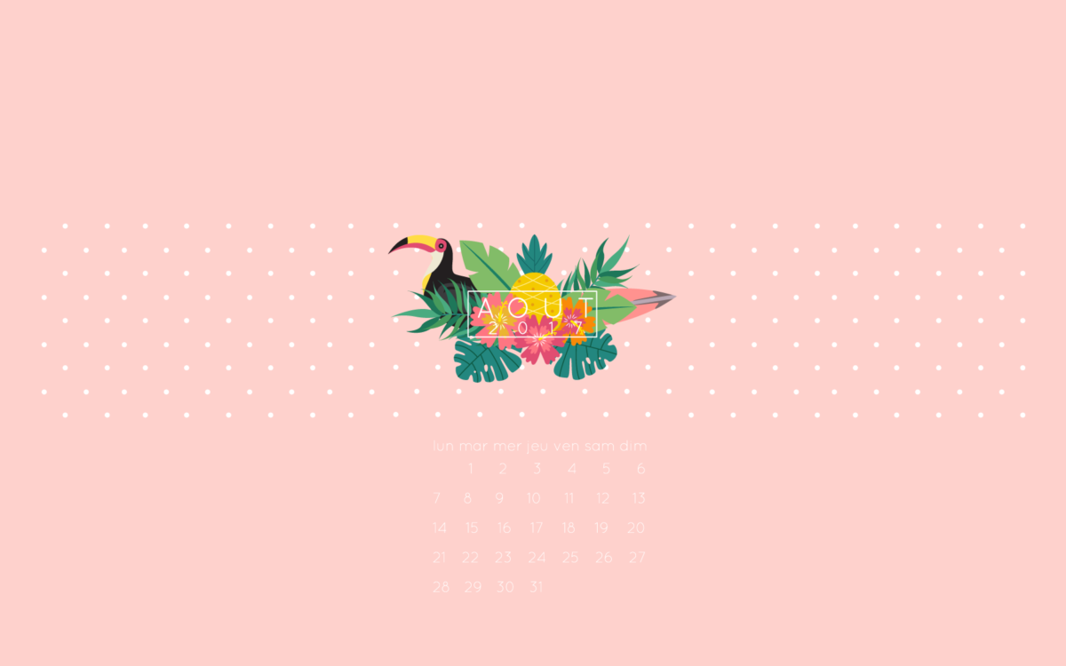 Comme pour le mois de Juillet, j’ai voulu un calendrier très estival et pour ne pas reprendre le flamand rose, je suis partie sur le pélican, les feuilles, l’ananas, toutes ces petites illustrations très à la mode en ce moment. J’espère que le calendrier et ses petits bonus vous plairons toujours. Surtout n’hésitez jamais à partager autour de vous.