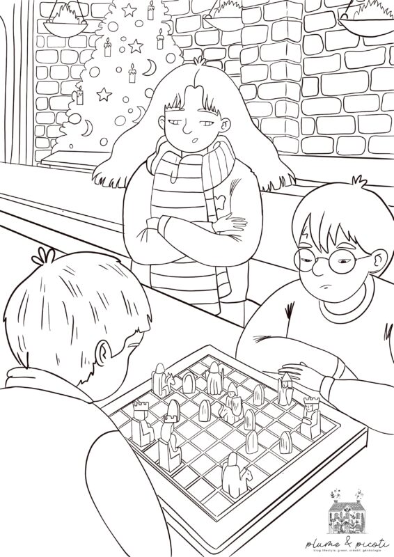 En ce joli dernier dimanche de janvier, je vous retrouve avec un nouveau coloriage spécial abonnés ! Cette fois, il s’agit d’une scène d’Harry Potter dans laquelle vous pouvez retrouver Harry, Hermione et Ron dans la grande salle, jouant aux échecs pendant les vacances de Noël. Petits et grands pourront s’amuser autour de ce coloriage avec crayons de couleurs, feutres ou différentes peintures selon le papier choisi pour imprimer.