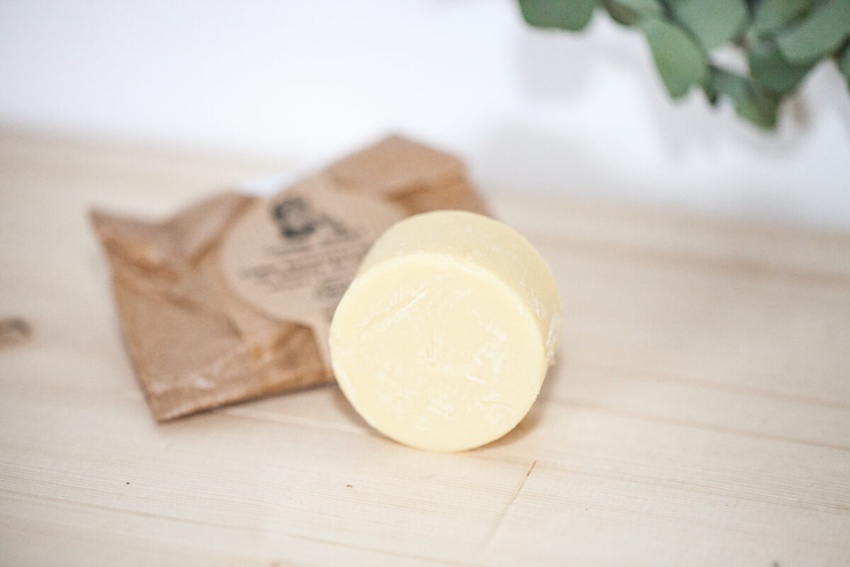 Après s’être lavés, nous passons à la crème pour hydrater notre peau à l’huile d’olive et au beurre de karité. Une crème solide qui promet d’hydrater naturellement le corps grâce à simple contact chaleur/peau/crème. Une jolie alternative zéro déchets !