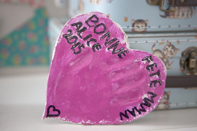 Alice a voulu en créer une seule avec un petit coeur, mais avec un coeur plus grand, vous pouvez créer l’empreinte des deux mains, de chaque côté du coeur (ou mettre les mains de chaque enfant).