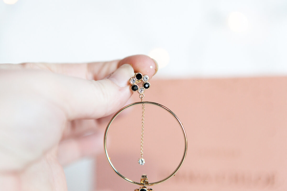 Deux superbes boucles « mix and match » : une puce sur laquelle est montée une boucle et une petite chaînette. Le genre de bijou que j’apprécie énormément, je suis fan des boucles d’oreilles, celles qui n’en dérogent pas : elles semblent de bonne qualité et sont parfaites pour sortir mais aussi au quotidien.