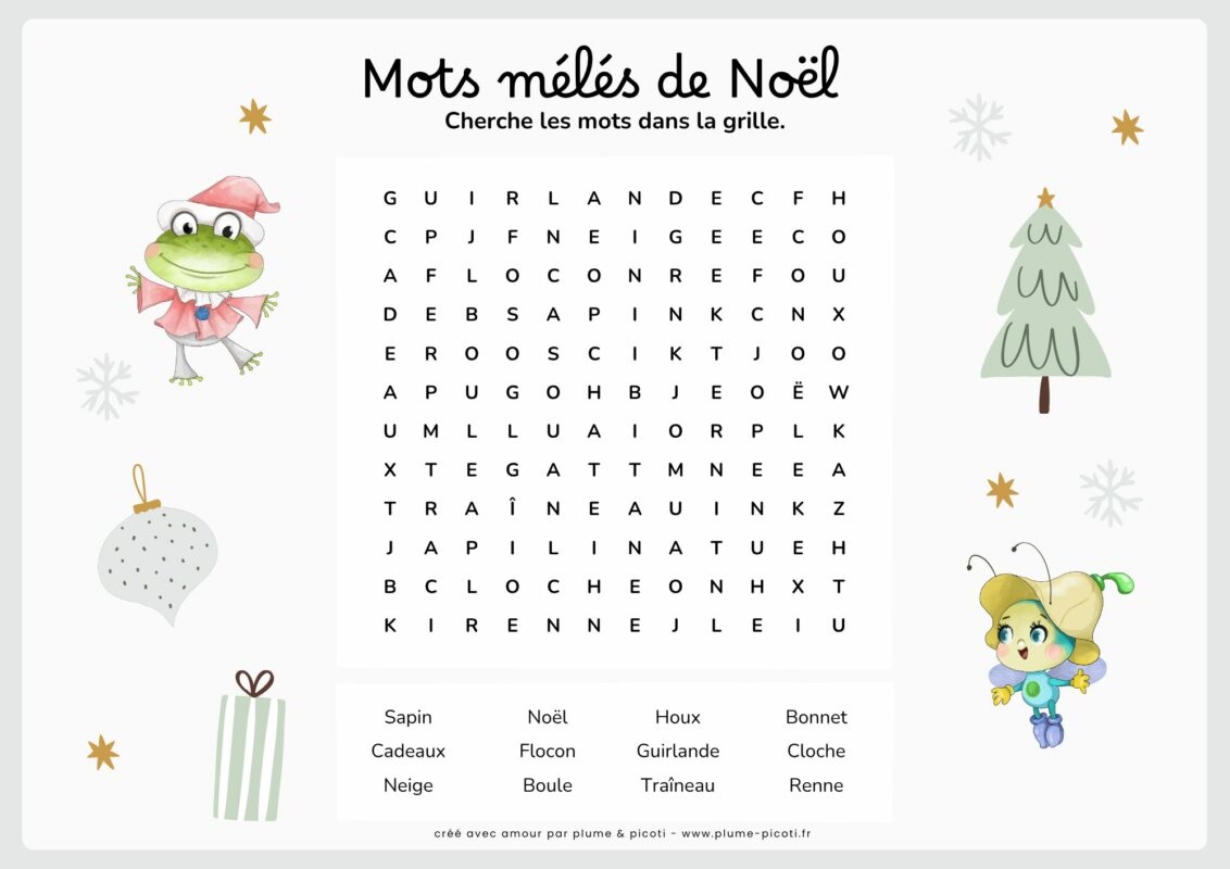 Ce mot mêlé a été spécialement conçu pour Plume & Picoti, avec une sélection de mots autour de la magie de Noël : décorations, gourmandises, traditions, petites joies de saison… De quoi plonger tout de suite dans l’ambiance !