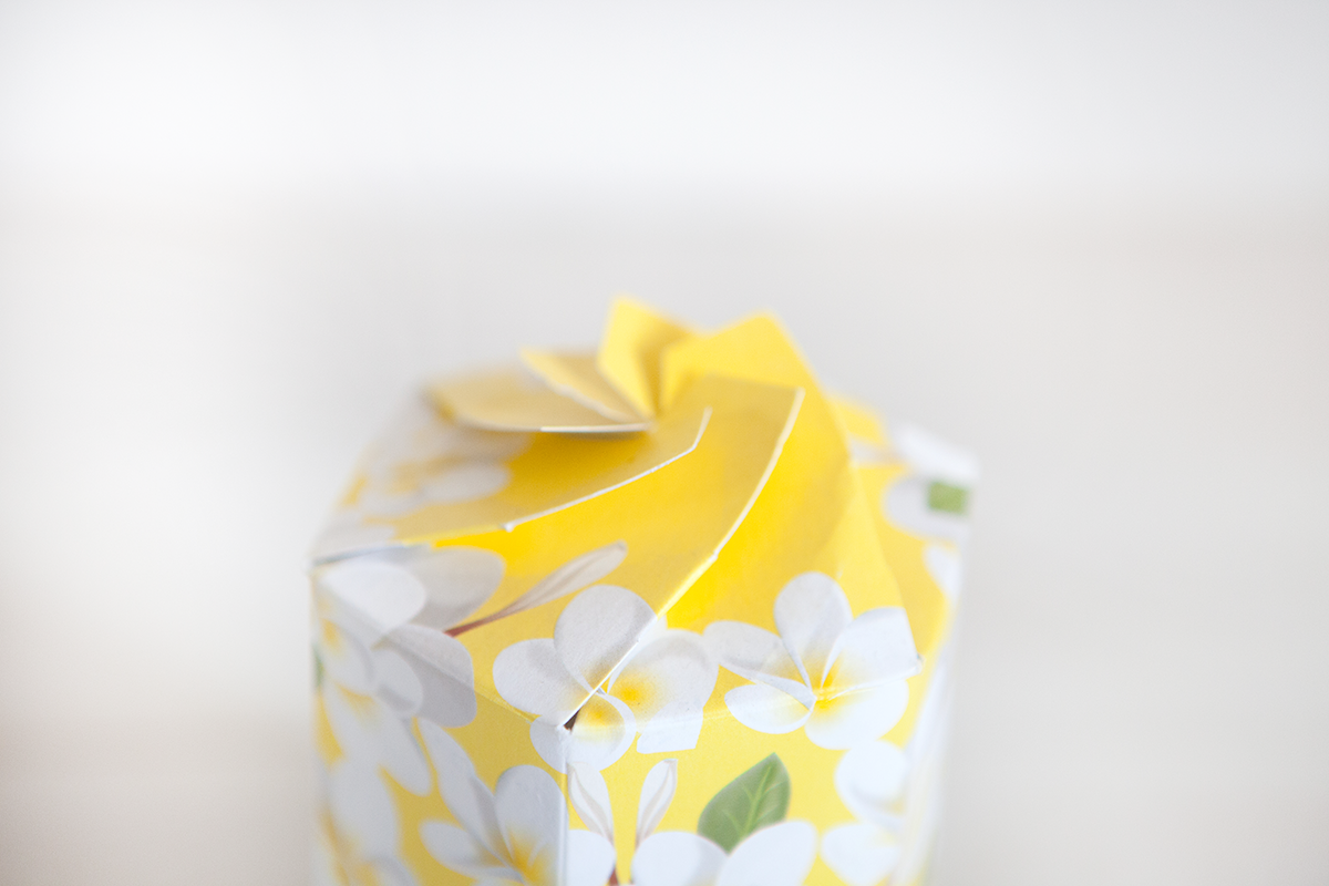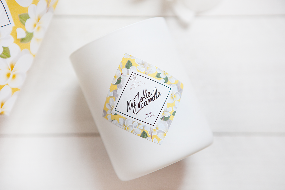 Comme la dernière fois, je craque complètement pour le packaging du produit My Jolie Candle. La bougie Monoï est présentée dans une boite cartonnée aux douces couleurs estivales. Le Jaune présent n’est pas trop flashy et la boite reste très féminine.