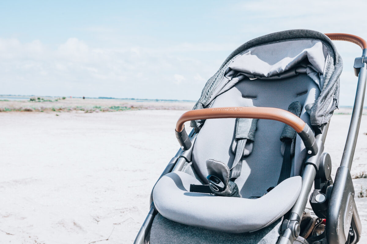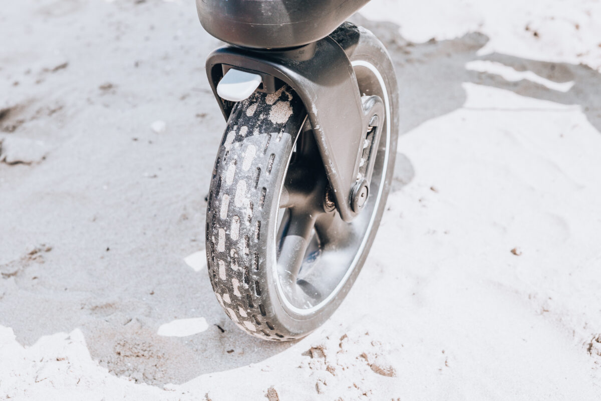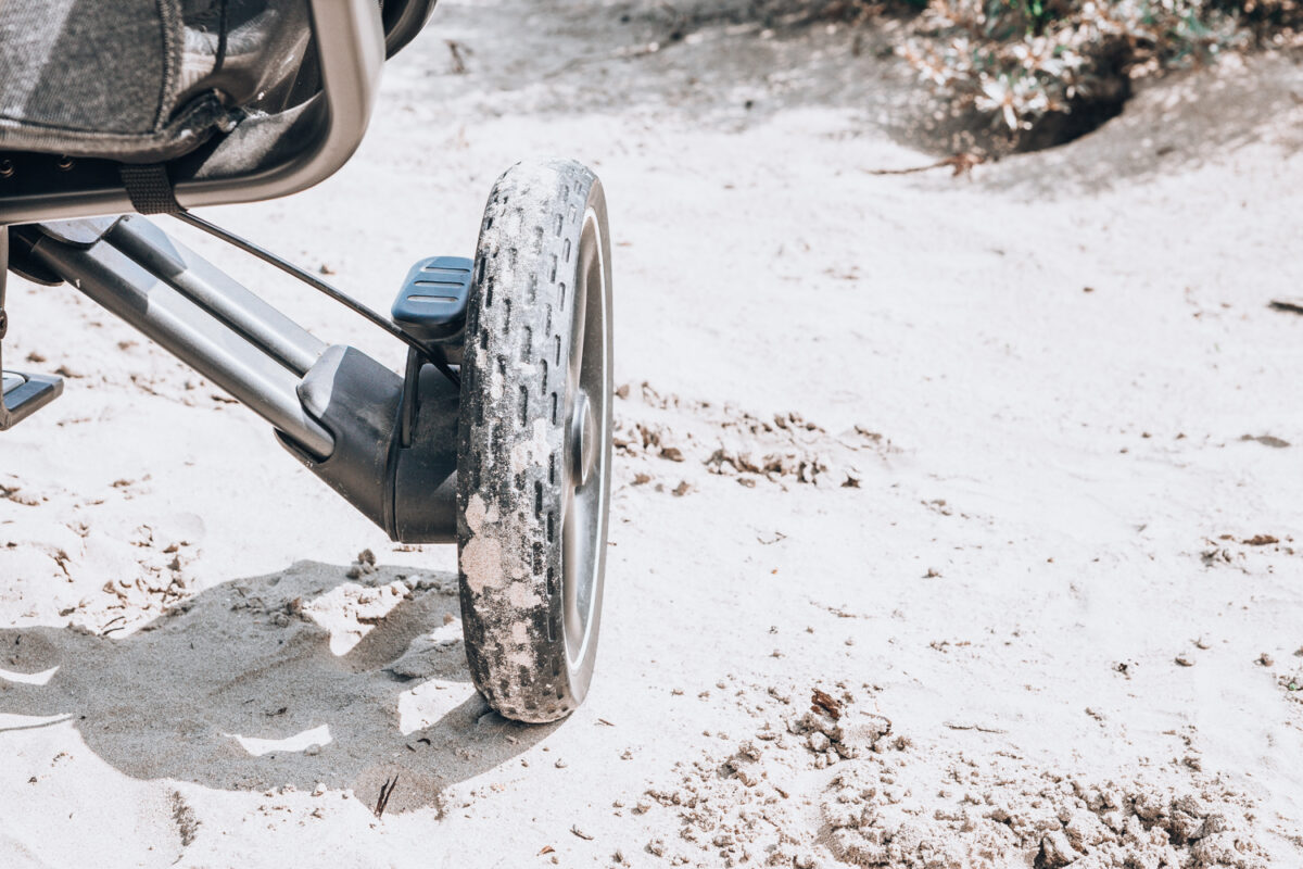 Ce qui fait de la poussette une tout terrain, ce sont bien évidemment ses roues. Il ne s’agit pas ici de roues pneus alors, pas de risques de les voir crever. Il s’agit de roues en caoutchouc durable et résistant. La poussette a été utilisée et testée chez nous sur différents types de terrain : du sable comme cet été sur les photos ou encore en campagne, dans des forêts boueuses ou même sur les trottoirs herbeux de notre campagne : elle passe partout !